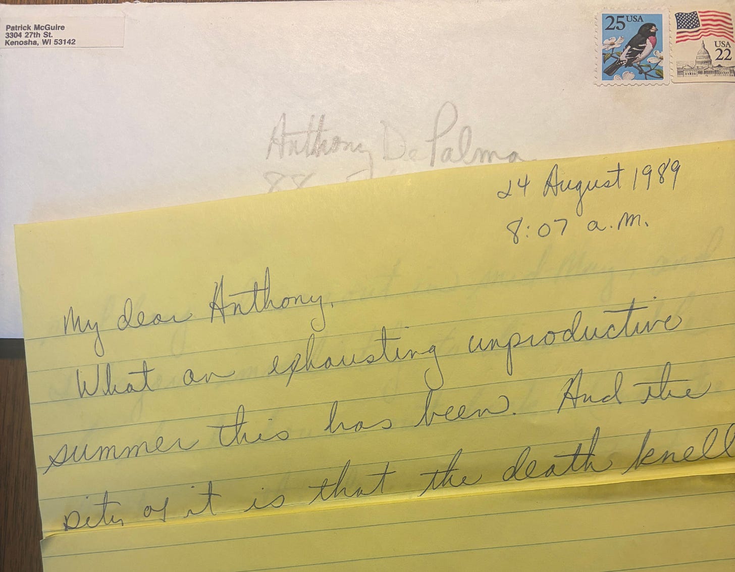 There was one more surprise in there—a letter, addressed to me and stamped but never sent. Of course I opened it. It was time-stamped 8:07 a.m. 24 of August, 1989. Unlike so much of our correspondence, this one wasn’t directly about the craft of writing as much as it was about the challenge of living. I can picture him at the table or back in his study writing in long hand on a yellow legal pad. “I’ve just dropped Anna off at school or her first day of the new school year,” he wrote. “On Monday the kids go back, and Tuesday week I go back.”